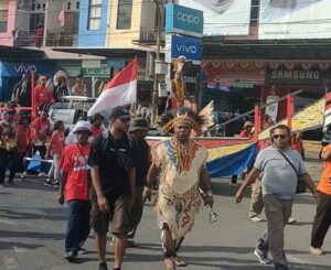 kepala Suku Besar Arfak Papua Barat Dominggus Mandacan di arak arak dari kompleks Fanindi dan Finish di Lapangan GOR Sanggeng Manokwari.